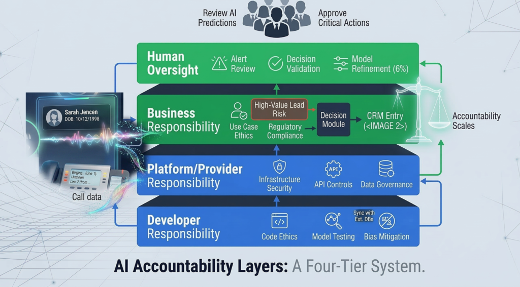 Every AI deployment should include a documented accountability chain identifying who owns monitoring, escalation, and corrective action.